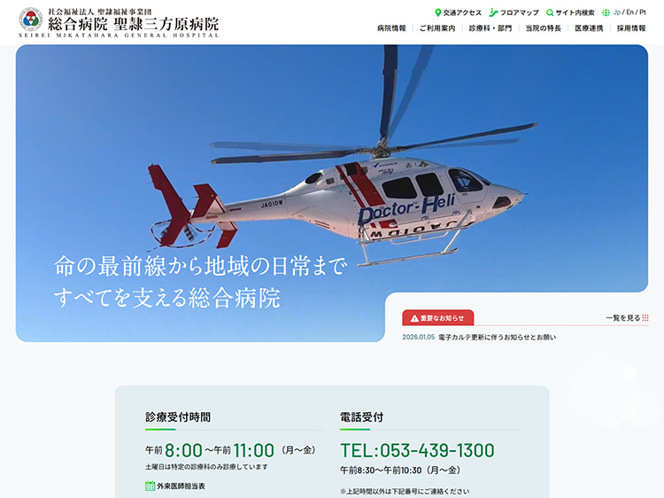 浜松地域の医療を支える中核拠点である、聖隷三方原病院様のウェブサイトリニューアルを担当させていただきました。同院はドクターヘリを擁する高度救命救急センターや日本初のホスピス、最新鋭のロボット手術、てんかん治療など、超急性期から緩和ケアまでを担う国内屈指の高度専門医療機関です。本プロジェクトでは公式サイトをはじめ、採用サイトや聖隷おおぞら療育センター、聖隷ホスピスなど、計6つの関連サイト制作を一貫して手掛けています。