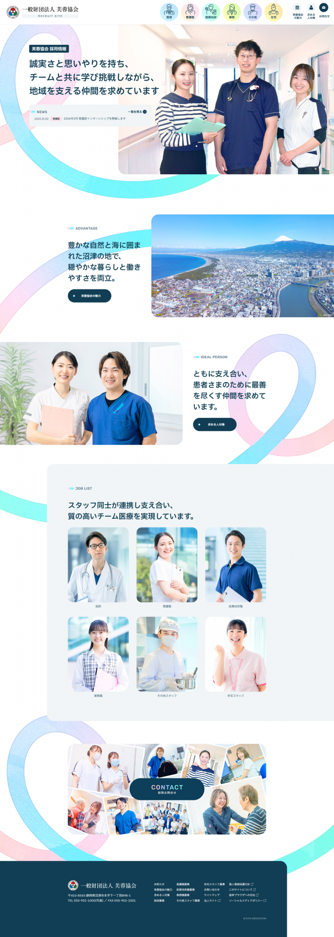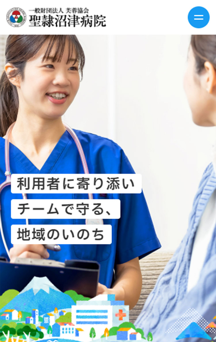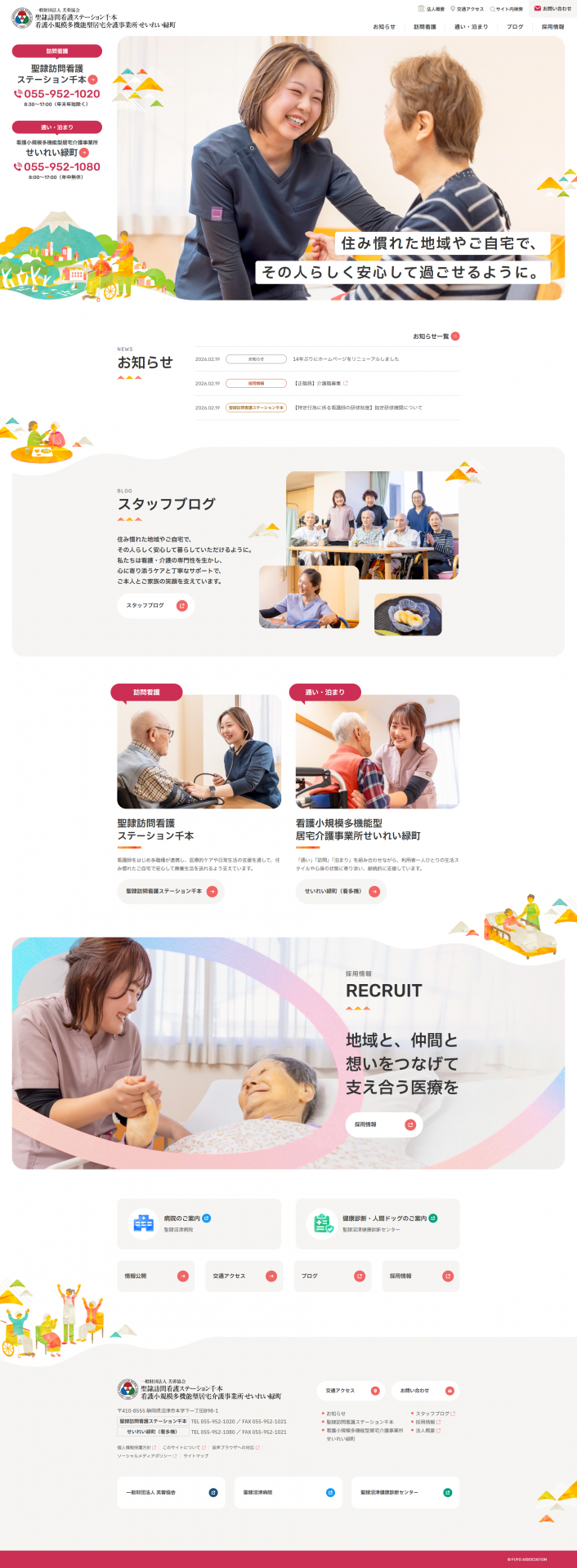 デザイン面では、各施設と沼津の自然・地域環境をモチーフにしたオリジナルイラストやグラフィックを採用し、地域に根ざした法人としての親しみやすさを表現。柔らかな印象を大切にしながら、医療・福祉分野のサイトとして求められる視認性・可読性を確保し、カラーコントラストに配慮して制作しています。