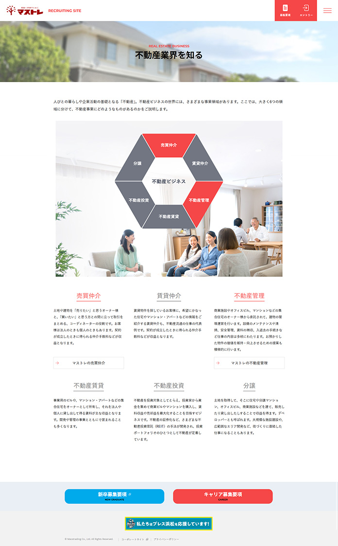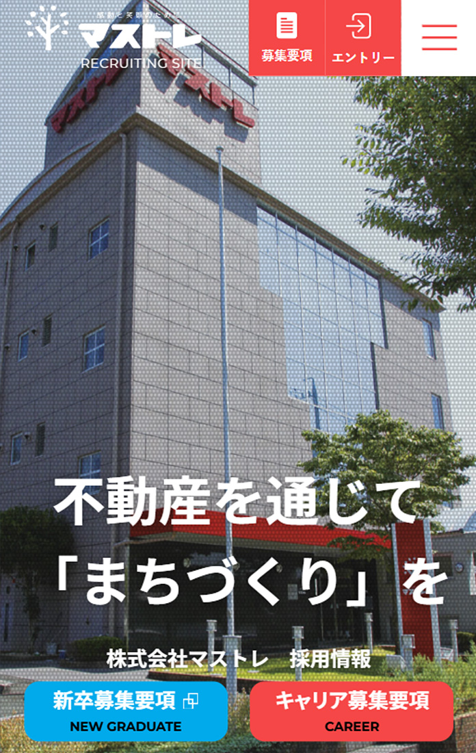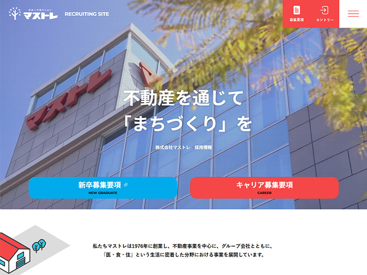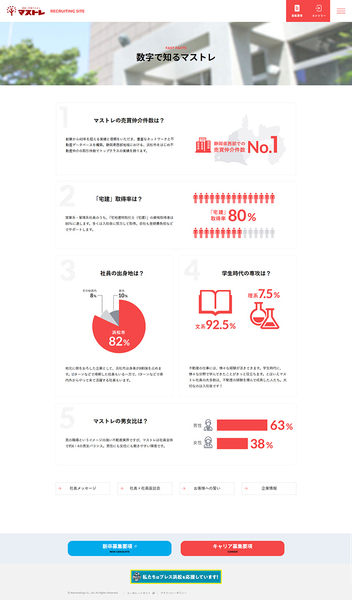 地元・浜松に密着し、「医・食・住」の各分野で事業を展開するマストレ様の、リクルーティング用サイトを制作しました。特に新卒の学生ユーザーを意識し、レスポンシブデザインでスマートフォンに対応。デザインも白を基調としつつ、写真を多用して、明るく親しみやすい印象に配慮しました。また、業界や会社の魅力をわかりやすく伝えるため、不動産の仕事の解説や、インフォグラフィックを活用した「数字で知るマストレ」など、コンテンツも充実させています。