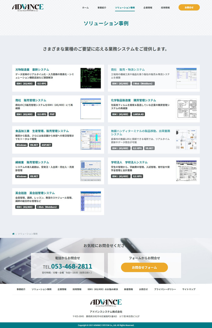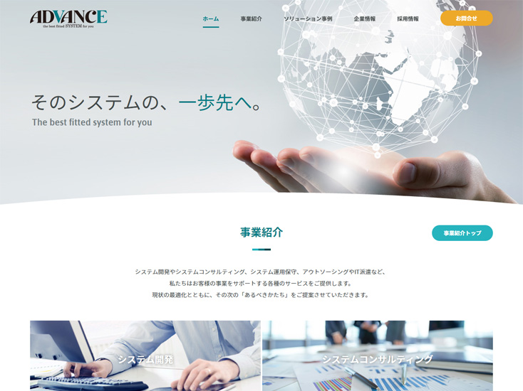 システム開発やシステムコンサルティング、システム運用保守、アウトソーシングやIT派遣など、顧客のビジネスをトータルに支援するアドバンスシステム様。社名にも込められた「常に一歩先のシステムをご提案する」という思いを、未来を感じさせるイメージビジュアルで表現しました。「顧客との出会い、仲間との出会いを実現するウェブサイト」というコンセプトに基づき、メインコンテンツのひとつである事例紹介ページには専用テンプレートを用意。随時、拡充できる作りになっています。また、雰囲気が伝わるオフィス風景や社員写真を活用し、採用コンテンツの「会社の魅力をキーワードで語るページ」と併せて、リクルート面の訴求にも配慮しました。