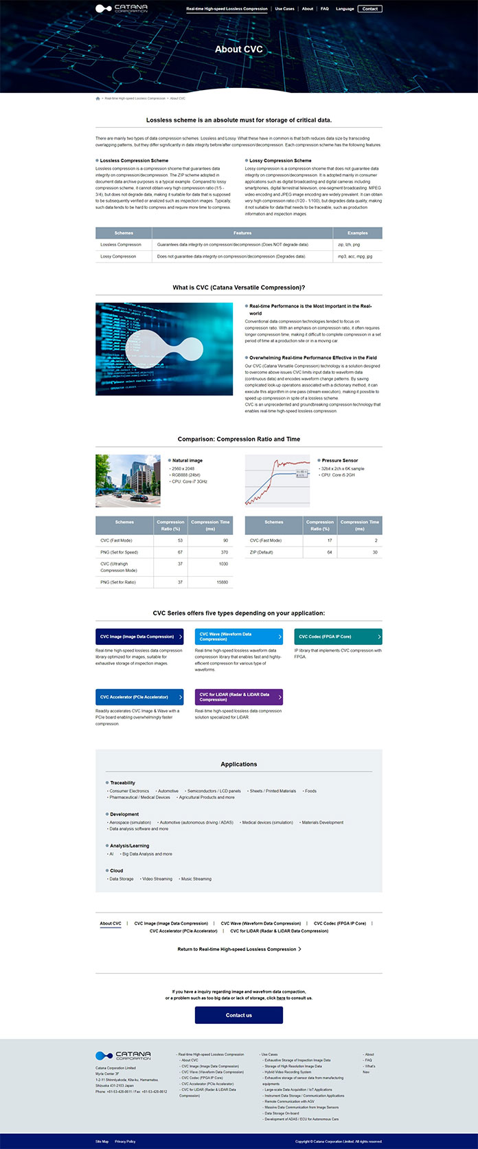 「アプリケーション」開発にとどまらず「ミドルウェア」や「ドライバ」といった、より汎用性の高い領域も手掛けるソフトウェア開発会社である株式会社カタナコーポレーション様。同社の「ミドルウェア」主力商品である独自のデータ圧縮技術「CVC圧縮」を全面的にフィーチャー。導入実績では半導体工場からADAS(先進運転支援システム)の研究開発用途まで、多岐にわたる実績をイラストを交えて紹介しています。コンテンツはもちろんCMS自体のバックアップも標準装備されたCMSプラットフォームSima®Cloud(シーマクラウド)を活用。ユーザーの持つデバイスにデザイン表示が自動最適化されるレスポンシブデザイン化、英語圏向けサイトの充実・整備など、先進の独自技術に注目の集まる同社のグローバル展開をさらに加速させています。