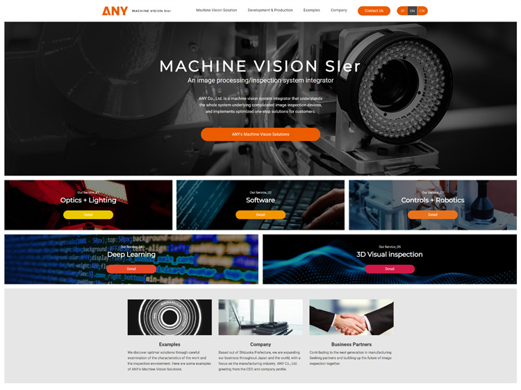 高まる「製造物の品質向上」と「省人・省力化」へのニーズに応え、世界的に導入が加速している「画像検査装置」。従来はカメラやソフトウェア、メカトロニクスなどそれぞれの専門家に分かれていたこの分野に「システムインテグレータ」の視点を採り入れ、ワンストップソリューションを実現している株式会社ANY様のウェブサイトを制作しました。弊社ではかねてよりロゴ開発・会社案内パンフレットの制作を担当させていただいており、当ウェブサイトは同社のブランディング計画の一環としての位置付けとなります。ウェブサイトの設計に当たっては、事業特徴・サービス紹介を中心に据えるとともに、継続的な情報発信を実現するコンテンツとして実例紹介に注力。Sima®の事例管理機能により、同社の特長が伝わる「Before/After」画像や動作ムービーのタイムリーな掲載を支援しています。